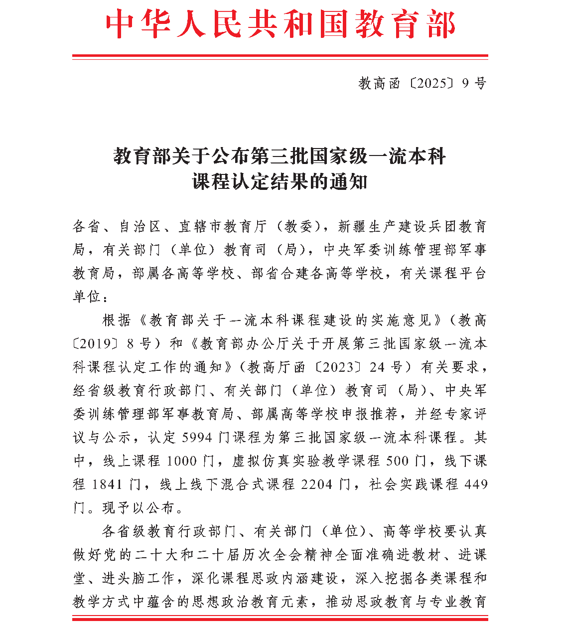 近日,教育部印发《关于公布第三批国家级一流本科课程认定结果的通知》(教高函〔2025〕9号),百家乐规则