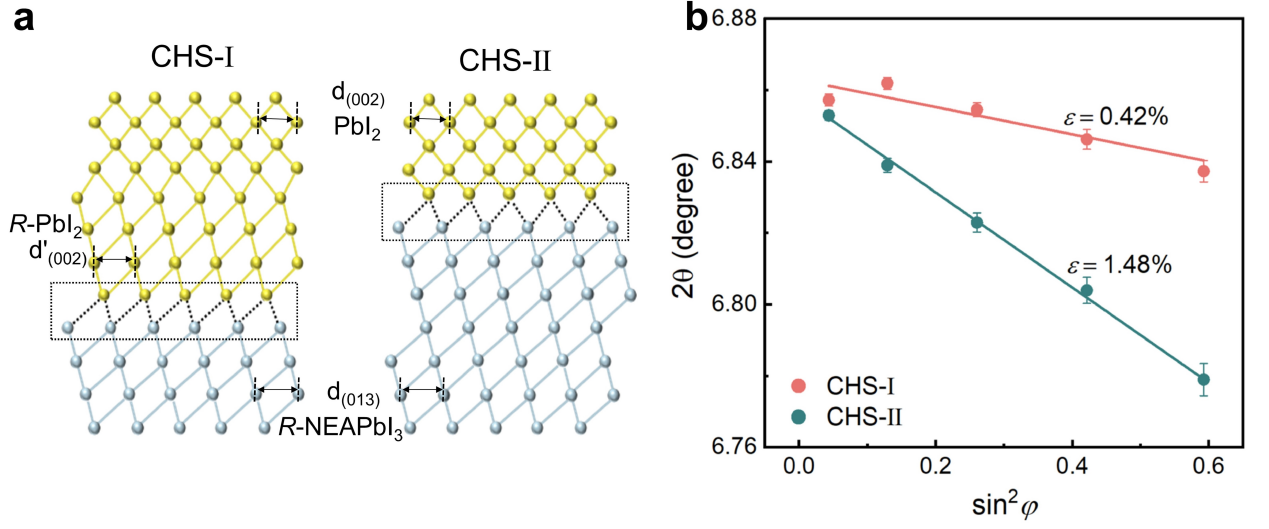图1 手性界面结构表征示意图:(a) 有手性界面异质结构(左)和无手性界面异质结构(右)晶格结构示意图;(b) 有/无手性界面时残余应变分布。